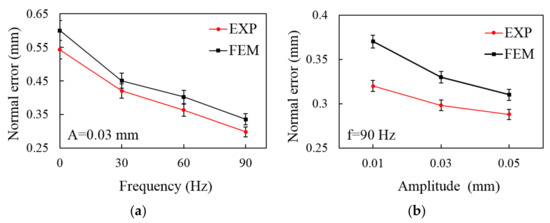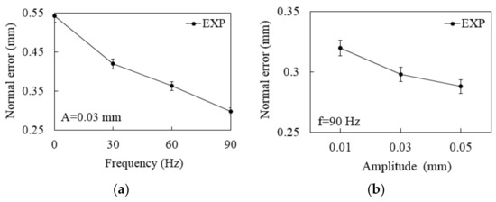 When the frequency is too small, its normal accuracy is weak. Once the frequency exceeds 30 Hz, the vibration energy absorbed by the material transitions the kinetic and potential energies of the atoms, which is then transformed into the material’s plastic deformation performance, reducing Young’s modulus and causing the material to have a softening effect [36]. The residual stress in the sheet after unloading is reduced, sharply reducing the part’s normal geometric error. It is worth noting that the trend of the simulation results is the same as the experimental results, and the average error is only 3%, which verifies the accuracy and feasibility of the FE model in this study.