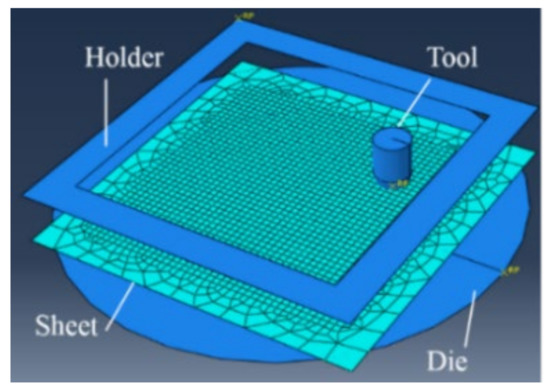 As shown in Figure 15, the LFV-SPIF model was established, comprising sheet metal, forming tool, holder, and die. The sheet material is a regular quadrilateral, with a length and width of 100 mm, and an initial thickness of 0.5 mm. The clamp is simplified into an upper holder and lower die. The holder has an inner length and width of 80 mm and an outer length and width of 100 mm. The forming tool is a cylindrical, hemispherical tool for which the ball head’s size is mm. Because the deformation of the fixture and tool is negligible during the forming process, the tool, holder, and die are set as rigid analytical bodies without material property definition to improve the calculation efficiency. A shell element with a four-node reduced integral (S4R) divides the sheet model’s mesh, and the mesh size is set to 2 mm × 2 mm [35]. In addition, the Mises yield criterion is used in the finite element method (FEM) simulation. Table 7 shows other simulation conditions, such as mesh generation, material model selection, and contract conditions.