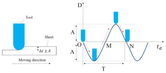 During the LFV-SPIF process, the tool performs periodic reciprocating actions along the axis while moving the toolpath (Figure 16). From Figure 16, the low-frequency vibrations during the tool’s machining are uncomplicated harmonic vibrations with frequency f and amplitude A. The tool starts from point O and sinusoidally moves axially. is the forming time, and D is the vibration displacement. During one cycle, the tool and the sheet material start to contact and squeeze downward at point O during processing. When the maximum amplitude is reached, the tool moves upwards. The tool and the sheet material are still in contact until point M begins to separate. The tool continues to move upwards to the maximum amplitude, starts moving downward to point N, and recontacts the sheet metal to complete a cycle. At the MN segment, the tool is separated from the sheet material, accounting for half of the entire cycle. Therefore, in theory, the tool is in contact with the sheet during only half of each vibration cycle.