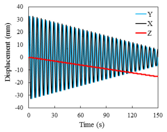 Here, A and f in the equation represent the amplitude and frequency of low-frequency vibration parameters, respectively. When f = 90 Hz and A = 0.03 mm, the circular frequency’s value is 565 (). To make a truncated cone with a diameter of 70 mm and a depth of 15 mm, the movement time is 150 s, and the relationship between displacement and time in all directions is extracted (Figure 17). Following the profile toolpath, the motion trajectories in the X and Y directions are circular, and the motion in the Z-direction is maintained constantly downward, macroscopically.