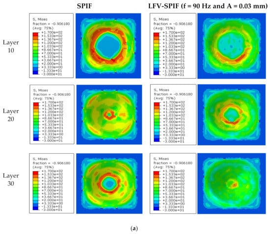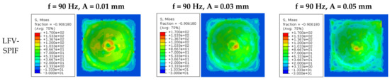- Implicit analysis revealed the sheet’s residual stress distribution after unloading during the LFV-SPIF process. Through comparison, it was found that the axial and normal residual stresses are effectively reduced with increase in amplitude and frequency. Furthermore, the residual stress reduction improves the normal forming accuracy of the formed products. As the frequency increases to 90 Hz, the average accuracy of the formed product can be increased by 46.9%.