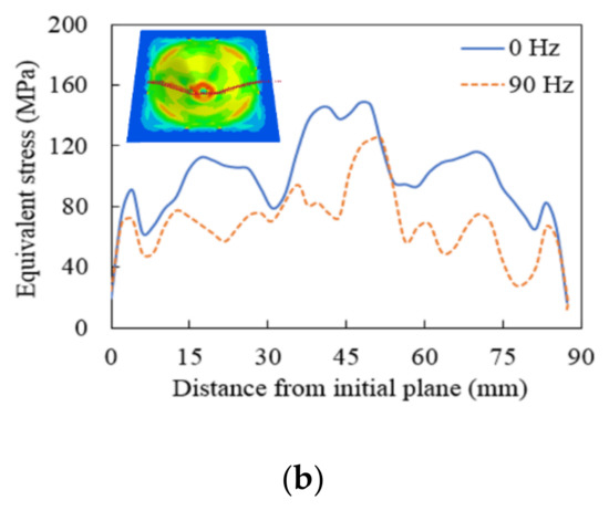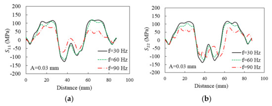 Residual stress distribution under different frequencies, (a) , and (b) .
