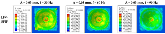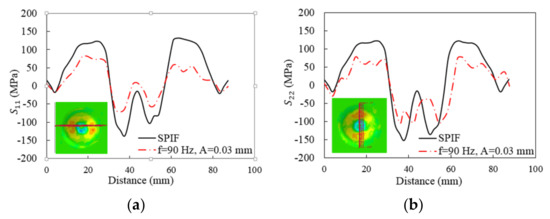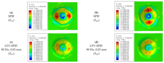 Comparison of maximum residual stresses between SPIF and LFV-SPIF process (f = 90 Hz and A = 0.03 mm).