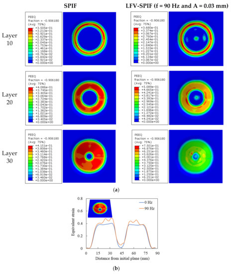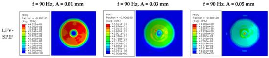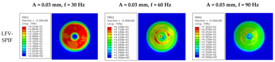 - The LFV-SPIF equivalent strain values and distributions are similar to the SPIF process in the early forming stage. However, as the forming continues, for LFV-SPIF, a phenomenon of concentrated strain distribution occurs, and the equivalent strain value is large. When A > 0.03 mm or F > 60 Hz, the vibrating tool’s instantaneous press amount increases, the material’s strain rate and deformation energy increase, and the equivalent strain extreme value increases accordingly. The high frequency leads to more contact between the sheet and the tool per unit time, resulting in an uneven strain distribution and local strain concentration, decreasing the uniformity of the thickness distribution after the material is formed.