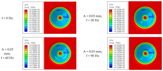 The acoustic softening effect and the vibration plastic softening effect refer to applying vibration to change the processed material’s plastic mechanical properties, affecting the material’s deformation mechanism and producing a softening phenomenon, reducing the limit shear force during the forming process [37]. The acoustic softening effect related to the material’s internal structure is challenging to simulate using finite elements. Therefore, the material’s constitutive relationship must be modified to reflect the acoustic softening effect of vibrations on the material. In subsequent research, constitutive model parameters will be determined through experiments and applied to improve the simulation results.