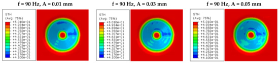 Because the forming force in the LFV-SPIF process is stable around 10 circles, the analysis efficiency is improved by extracting the forming forces of the first 10 circles for comparative analysis (Figure 29). From Figure 29, the changing trends of under the three amplitude groups are similar in which the average value of force during each circle is used to obtain the changing trend of for the different amplitudes. The amplitude positively correlates with when it is greater than 0.01 mm. When the amplitude is less than 0.01 mm, the vibrating tool’s force on the sheet is small. According to the Mises yield criterion, the sheet has more elastic than plastic deformation, and the material has not completely plastically yielded. When the vibrating tool moves to the second half in each sine cycle, theoretically, the vibrating tool should be separated from the sheet material instantaneously. However, the sheet material’s elastic energy is released, and the springback keeps the sheet material and vibrating tool in continuous contact, increasing the average value of . When the amplitude is greater than 0.03 mm, the vibrating tool’s direct impact exceeds the material’s yield strength. The deformation of the sheet is mostly plastic, which inhibits the springback due to elastic deformation. The vibration tool realizes the actual separation from the sheet metal in the second half of the cycle, decreasing the average of .