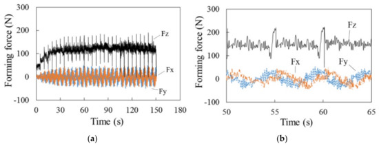 The measured axial forming force during the SPIF forming force is shown in Figure 8a in which the axial forming force showed a gradual and increasing rate of change. As shown in Figure 8b, a step within 18 s means that one circle has been formed, and a large instantaneous peak occurs at the step, indicating that the tool has an interlayer feed movement from the first layer to the second layer. The entire increased its limit near the 10th circle, and the forming process entered a stable stage where the influence of the sheet’s forming zone was approximately nonexistent, and its deformation only depended on the sheet’s characteristics (yield strength).