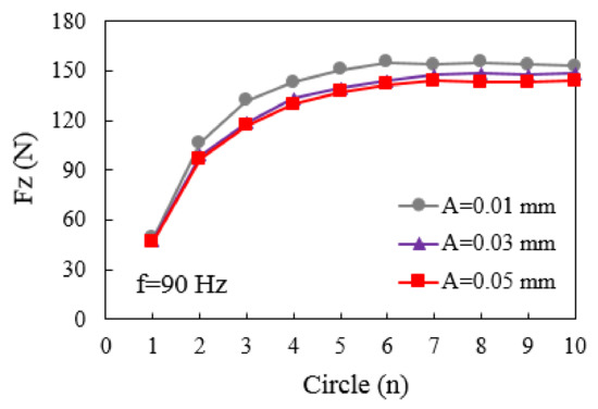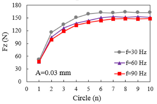 Because the forming force in the forming process was stable around 10 circles, the analysis efficiency was improved by extracting the forming forces of the first 10 circles for comparative analysis (Figure 11). From Figure 11, the changing trends of under the three amplitude and three frequency conditions were similar; the average values of force during each circle were used to obtain the changing trend of for the different amplitudes. It can clearly be seen that as the amplitude and frequency increased, the vertical force decreased continuously.