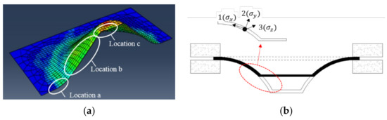 As shown in Figure 32a, the workpiece can be divided into a bending transition zone a, inclined plane deformation zone b, and bottom stabilization zone c, along the deformation path. At the same time, the unit body of the side wall is extracted and the residual stresses in three directions (1, 2, and 3) are defined (Figure 32b). Among them, direction 1 () represents the wall direction parallel to the generatrix of the truncated cone, direction 2 () represents the circumferential direction tangent to the circumferential direction of the truncated cone, and direction 3 () represents the normal direction perpendicular to the plate. The wall residual stress , circumferential residual stress , and normal residual stress correspond to , , and in the ABAQUS simulation results, respectively. Because the shell elements are used, and does not change much, no comparative study was conducted on . Therefore, this study focuses on the principal stresses and . The positive value represents the tensile stress, and the negative value represents the compressive stress.