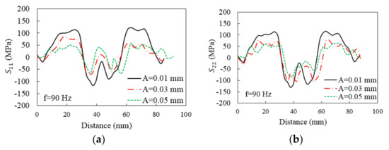 Residual stress distribution under different amplitudes, (a) , and (b) .
