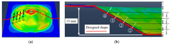 Following the same experimental plan for the forming force part, for all cases, four measurement positions were selected on the wall area at intervals of 3 mm from the bottom surface for each formed part, and the gap between each position with the target shape was measured (Figure 13). Finally, the average value of these points was calculated (Table 5 and Table 6).