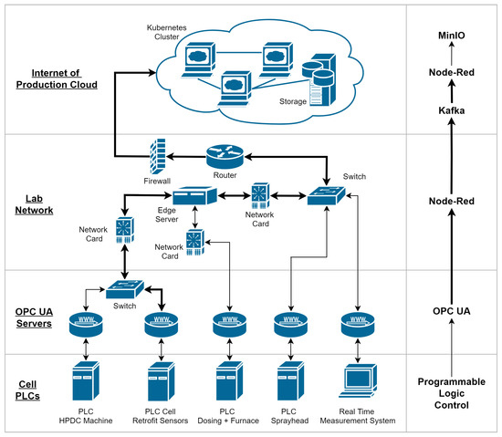 In order to enable connectivity of all five OPC UA servers to the IoP cloud, it was necessary to install an edge server to access the separate networks of the HPDC cell components. In the case of the spraying system and the external measurement system, it was possible to assign IP addresses from the facility network and access them from any device in the network. It was not feasible to use this strategy for the remaining servers of the cell. They could not be reliably accessed from different internal and external networks, since the multiple gateways led to instabilities with regard to the availability of the OPC UA servers in the facility network. The edge server is equipped with two additional USB 3.0 1000 MBit/s network interfaces that are assigned IP addresses and suitable gateways for two separate networks to overcome this issue: the HPDC machine network as well as the network of the PLC for the holding furnace and dosing system. A consumer grade SBC Raspberry Pi 4 Model B with 8 GB of RAM (Raspberry Pi Foundation, Cambridge, UK), that runs the 64 bit version of the Raspbian Buster operating system (Raspberry Pi Foundation, Cambridge, UK), is deployed as the edge server. All process values from the five PLCs are initially processed via Node-Red flows and consecutively forwarded to Apache Kafka from this device.