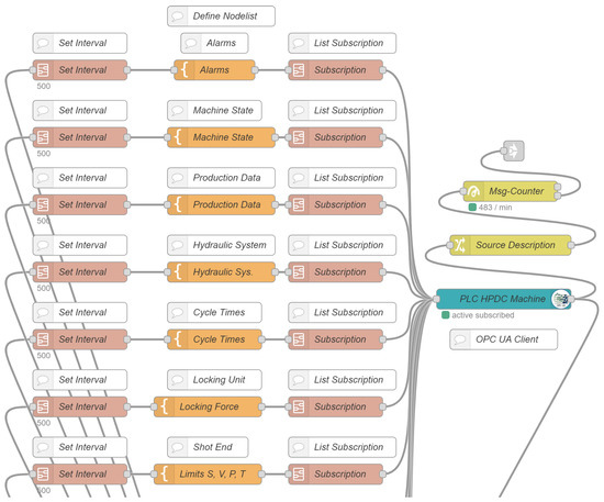 A key benefit of our data streaming pipeline implementation lies in the ease of adding new devices and server nodes that provide additional process data, while being modular in terms of the used technology stack. Another advantage is the use of a graphical programming framework. Engineers with limited background knowledge or experience in using advanced programming languages can set up and extend flows for data extraction, processing and metadata injection within a few hours of the initial deployment of the data pipeline. Figure 2 depicts the edge side of the data pipeline for the HPDC machine PLC. Each of the five OPC UA servers is accessed with a separate flow in which the overall node list is separated into groups corresponding to subsystems of the machine to improve the usability. Access to specific node groups from the server for users that have no previous experience with the system is simplified by this structured approach.