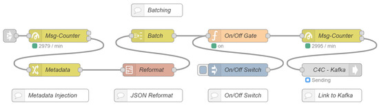 The metrics used to quantify the pipeline’s performance are throughput, latency and ordering. All metrics were calculated as averages within a time window of s. The throughput was measured by counting the number N of messages that were received by the Node-Red flow which connects the Kafka ingestion with the MinIO object store within the cloud: