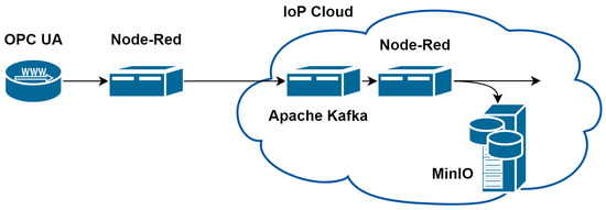 Figure 1 depicts the network setup which was implemented to conduct the presented study. All OPC UA servers can be accessed via an edge server. One instance of the Node-Red v2.0.6 (The OpenJS Foundation, San Francisco, CA, USA) [12,13] software package runs locally on the edge server and facilitates the deployment of multiple data flows to enable connectivity to the OPC UA servers. It provides the means to transmit the data to the cloud. Apache Kafka v2.6.0 (The Apache Software Foundation, Wilmington, DE, USA) [14] serves as a message broker and runs within a Docker container [15] on a Kubernetes cluster v1.19.10 (Cloud Native Computing Foundation, San Francisco, CA, USA) based [16,17] Internet of Production cloud (IoP cloud) at the data center of RWTH Aachen University. A MinIO object storage version 2021-11-24T23:19:33Z (MinIO, Inc., Palo Alto, CA, USA) [18] represents a first simple version of a data lake. A second instance of Node-Red is deployed in the cloud to facilitate data transfer from the message broker to the data lake.