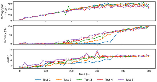 In case all transmitted messages arrive in the same order in which they were sent, the order metric will take the value one. Otherwise, the value of the metric will increase. The results for five consecutive load tests are shown in Figure 7.