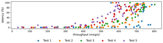 A simplified evaluation of the performance of the pipeline can be achieved by plotting latency as a function of throughput, as shown in Figure 8. It can be clearly seen that a transmission of at least 300 messages per second was possible in all experiments. Delays in data transmission only occurred above this point.