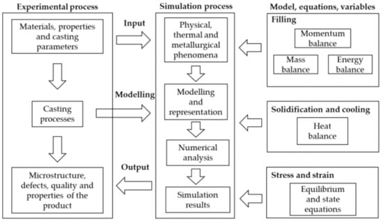 Numerical methods are frequently based on the application of a mesh with small elements throughout the volumes that are part of the system. These methods generally replace differential equations that describe heat transfer with approximation strategies that include finite differences or finite element methods [13]. Figure 1 shows the relationship between a real casted part, simulation procedure, modelling of physical phenomena, government equations, and output variables.