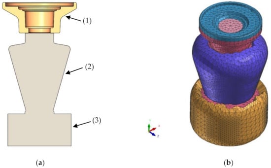 Design of the casting assembly. (a) Cross section view in SolidWorks® and (b) model mesh distribution in ProCAST® software. (1) Pouring cup, (2) gating system, and (3) part.