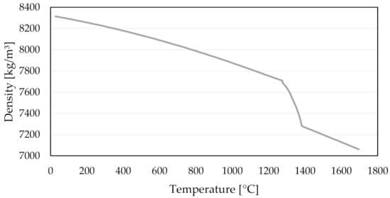 The variation of density, thermal conductivity, and enthalpy as a function of temperature in the range of 30 °C to 1700 °C is shown in Figure 3, Figure 4 and Figure 5. It is seen that as temperature rises, density decreases. This effect is quite noticeable between solidus and liquidus temperature. Thermal conductivity linearly increases from room temperature up to the solidus point. During the transition phase solidus-liquidus, the thermal conductivity decreases quickly and after the liquidus point, it increases once more. On the other hand, enthalpy increases from room temperature up to 1700 °C. Slope enthalpy increases significantly between the phase transition.