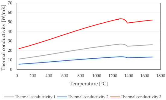 The thermal conductivity 1 (Figure 4) is the recommended curve for investment casting simulations by ProCAST® software. The other two curves were created to evaluate the influence of this parameter on the simulation results. The thermal conductivity of curve 2 is half of curve 1, and the thermal conductivity of curve 3 is double of curve 1.