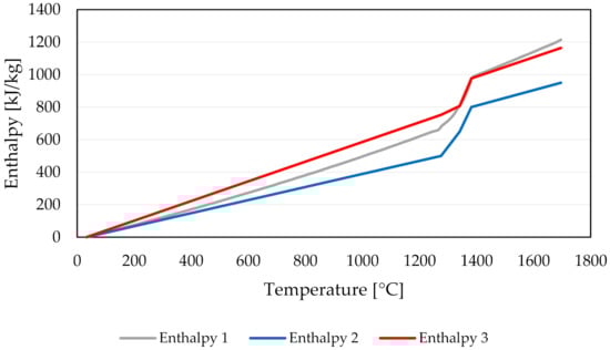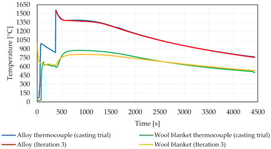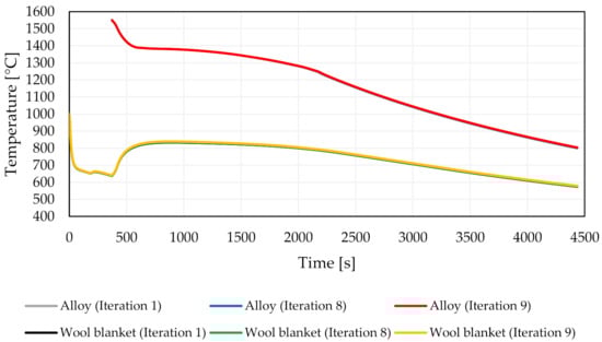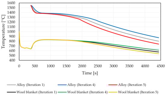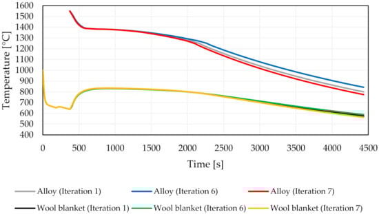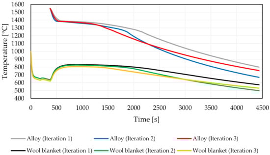 Figure 13 shows the influence of the enthalpy curve on the cooling behaviour of the alloy and wool blanket. It can be seen that in iteration 3, the solidus-liquidus transition is shorter (approximately 700 s) when compared with iterations 1 and 2, once the energy to transit from liquidus to solidus temperatures is lower. It can also be concluded that with a lower enthalpy value (e.g., enthalpy curve 1 vs. enthalpy curve 2), for the same amount of mass and energy lost, the decay of temperature is greater with a lower enthalpy value, which is the case of iteration 2. It is also possible to notice that, with a higher alloy temperature, a higher wool blanket temperature is observed.