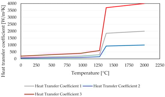 The interface between the alloy and ceramic shell is represented by a variable that is temperature dependent, as shown in Figure 7. The heat transfer coefficient 1 is the recommended curve for investment casting simulations by ProCAST® software. The other two curves were created to evaluate the influence of this parameter on the simulation results. The heat transfer coefficient of curve 2 is half of curve 1, and the HTC of curve 3 is double curve 1.
