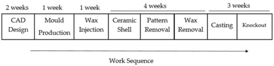 After these complex procedures, the ceramic shell was ready for casting. The materials used to prepare the set of wax model, shell mould, and blanket are listed in Table 3.