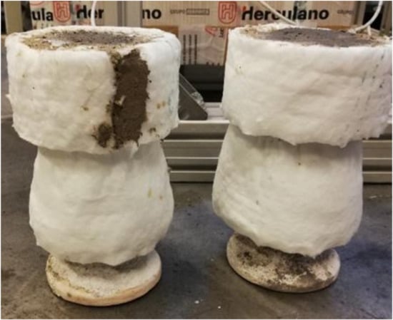 To obtain cooling behaviour information, thermocouples were placed in specific positions. The first one, at the casting centre, allows the retrieval of alloy thermal information. The second provides thermal information on the frontier between the shell mould and wool blanket. Two high-temperature thermocouples (S type) were used in this experience, as seen in Figure 11. One was positioned in the cylinder centre so that the alloy temperature could be registered. This specific thermocouple was inserted inside a quartz tube to reduce reading interferences and protect it from the poured metal. The second thermocouple was positioned inside the wool blanket. The data were then acquired using the LabVIEW 2012 SP1 software (NI, Austin, TX, USA).