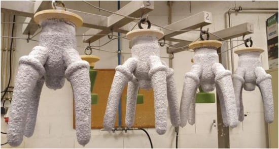 First, it was necessary to have a 3D-printed, accurate stereolithography (SL) pattern that would recreate the metal part, considering double shrinkage for wax and metal. With this pattern, it was then possible to obtain the mould where the wax pattern was injected. This mould produced several wax patterns, which were used for creating the ceramic shell moulds, a process that includes several steps. It was necessary to dip the wax pattern in a ceramic slurry and then a thin stucco (which thickness increases with the subsequent number of layers) was sprinkled over it to form the ceramic shell. The first layer was in contact with the metal surface part, containing materials with slightly different properties (includes grain refiner) and higher viscosity when compared with the following layers. The main reason for this is that the first layer plays a key role in grain size and roughness control. It is necessary to dry the model for a few hours before applying slurry for a new layer. After 7/8 layers, when the desired thickness is obtained, the shell mould was sent to flash fire dewaxing and sintering. Afterward, a fibrous ceramic wool blanket was applied around the shell mould (Figure 9). This blanket retains the heat in the shell mould and part, increasing the solidification time inside the chamber. Before pouring the metal, the ceramic shell (with the wool blanket surrounding it) was pre-heated at approximately 1000 °C.