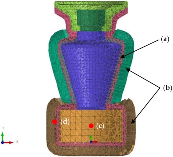 This element size distribution generated a model composed of 25,042 2D elements, 135,792 3D elements, and 48,054 nodes, as shown in Figure 2b. The chosen mesh density allowed for accurate results while optimising the processing time as far as possible.