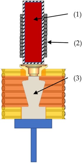 Vacuum furnace sketch. (1) Metal ingot, (2) induction coil, and (3) ceramic shell mould.