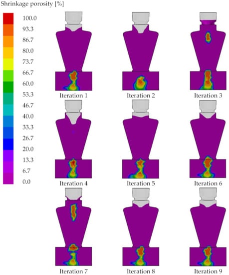 It is possible to observe, in Figure 17, a pattern of shrinkage porosity in the centre of the part in all iterations. In contrast, iterations 3 and 7 predict that there is a higher probability of shrinkage porosity at the top of the gating system and in iteration 4 there is a small probability of shrinkage porosity at the top of gating system. It is also important to mention that iteration 2 is the only one that does not predict shrinkage porosity in the transition zone between the gating system and part. These results are consequence of thermal properties of the ASTM F75 alloy and heat transfer coefficient between alloy and ceramic shell.