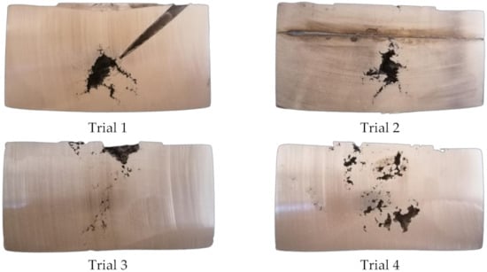 Visual inspection of the part, trial 1 to 4 (cross-section cut).