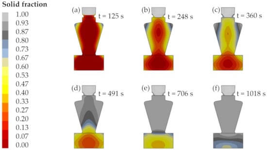 Solidification process of the casted part (cross section view). (a) 125 s; (b) 248 s; (c) 360 s; (d) 491 s; (e) 706 s; (f) 1018 s.