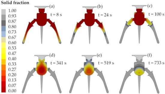 To explain why shrinkage porosity is observed in the centre of the gating system and part, the solidification process of the casting was analysed. It is seen in Figure 21a that after 125 s (about 2 min) of the pouring process, both the part and gating system are still liquid. Figure 21b,c illustrate that the solidification process starts from the external surfaces to the centre and after 360 s (6 min); in Figure 21c, the centre of the part is still liquid, whereby the gating system is already solid in Figure 21d. Figure 21e,f confirm that the gating system solidifies later.