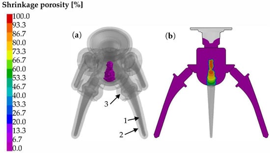 Hip prostheses shrinkage porosity prediction with PROCAST® software. (a) Isometric view and (b) cross section view in plane XY. (1) Hip prosthesis, (2) ceramic shell, and (3) wool blanket.