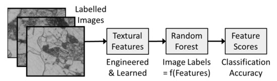 Analytical methodology based on the extraction of features from labelled textural images of materials, followed by assessment of the ability of a random forest model to discriminate between textures using the features as the input.