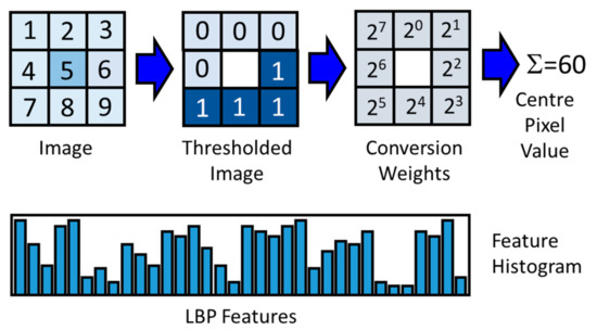 Local binary patterns are generated from greyscale images by comparing the intensity of each pixel in the image to the intensities of pixels in its neighborhood [46]. The differences in the intensities between neighboring pixels () and center pixels () under consideration is set to either 0 or 1, by applying a binary thresholding function s: