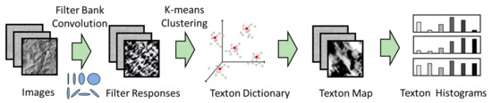 Textons can be viewed as the centers of clusters of a localized filter response space that are generated through convolution of a training set of images with oriented spatial basis functions arranged in a filter bank [51], as indicated in Figure 4. Each pixel in an image is mapped to this feature space, while the cluster centers in the space are typically determined by k-means clustering. These cluster centers comprise what is referred to as a texton dictionary. A texton feature associated with an image consist of a count of the number of pixels assigned to the specific texton channel [5].
