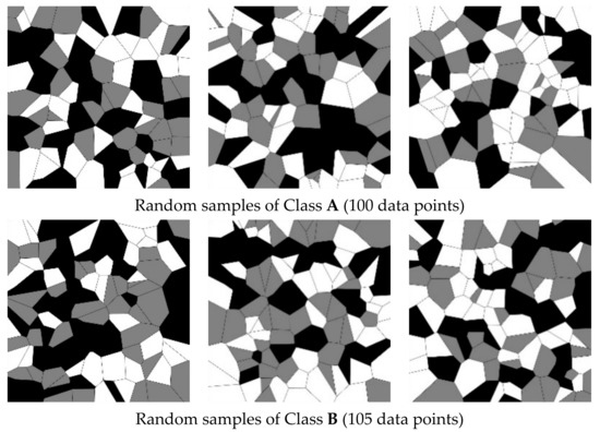 In the second case study, both classes of simulated textures were generated with equisized datasets of 1000 samples each. Texture dataset A was generated by random sampling of a bivariate Gaussian distribution with a mean vector μ = [0,0] and a covariance matrix of Σ = [1 0; 0 1]. Texture dataset B was generated by 50%–50% random sampling of a bivariate Gaussian distribution with a mean vector μ = [−0.05,0] and a covariance matrix of Σ = [1 0; 0 1], as well as a bivariate Gaussian distribution with a mean vector μ = [+0.05,0] and a covariance matrix of Σ = [1 0; 0 1]. This different generation process means that Class B contains more elongated grains than Class A. Examples of these simulated textures are shown in Figure 7.