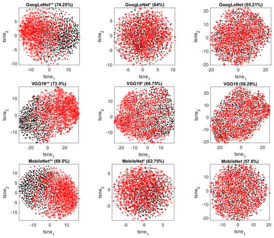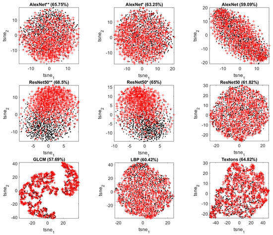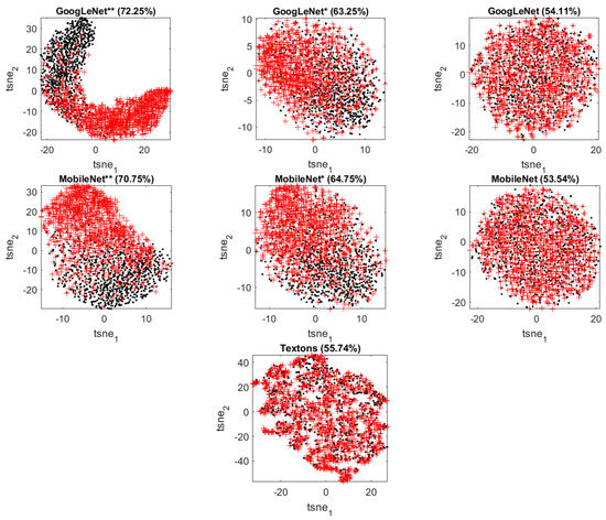 By making use of t-SNE plots, it is possible to visualize the extracted features in a two-dimensional score space and qualitatively assess the discriminative power of the different models. The t-distributed stochastic neighbor embedding (t-SNE) [59,60] algorithm constructs the points embedded in a low-dimensional space to best approximate the relative similarities of the points in the original high-dimensional space with those in the low-dimensional space. It does so by minimizing the Kullback–Leibler divergence between the two distributions by moving the embedded points.