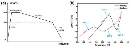 Vacuum induction and vacuum arc remelting are used for melting M50 bearing steel. The ingots are forged into blanks and then conducted to SA. The initial material used in this work is spheroidized annealed M50 steel. The chemical composition of the selected steel is presented in Table 1. To determine the phase transformation temperature of M50 bearing steel, the thermal expansion test was carried out using an MMS-200 thermal simulator testing machine, in which the schematic illustration has been presented in Figure 1a. The sample was first heated to 900 °C for 5 min at the rate of 1 °C/s, and followed by cooled to 550 °C at the rate of 5 °C/min. The measured expansion curves are displayed in Figure 1b. It was determined by the tangent method that the transformation temperature from ferrite into austenite ranges from 791 °C to 869 °C during heating, while the temperature ranges from 788 °C to 642 °C for the transformation from austenite into ferrite during cooling. From the thermal expansion results, the DET and ET will occur during the temperature range of pearlite transformation (from 788 °C to 642 °C).