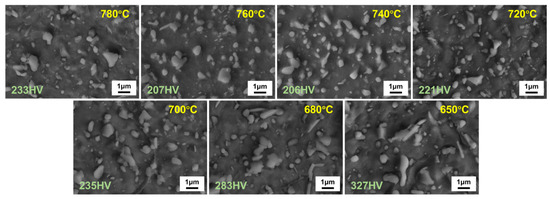 To obtain the accurate temperature range of DET, the samples were heated to 860 °C for 30 min in the resistance furnace (for partial austenitization) and then, respectively, cooled to different temperatures (780, 760, 740, 720, 700, 680, 650 °C). After holding for 30 min, the samples were directly water-cooled for microstructure observation. Figure 2 shows the microstructure of the samples subjected to pearlite transformation at different holding temperatures. It can be seen that the microstructure is mainly composed of spherical carbides for the samples at the holding temperature from 780 °C to 700 °C, while there are strip carbides in the matrix for the samples at the holding temperature 680 °C to 650 °C. In addition, the hardness results are shown in Figure 3 where it can be seen that with the decrease in holding temperature, the hardness decreases first and then increases. The microstructure and hardness results together confirm that the upper temperature range is dominated by DET and the lower temperature range is dominated by ET in the whole temperature range of pearlite transformation [21]. In this work, the WD is selected at the DET temperature ranges. Considering the finer carbides and lower hardness for the holding temperature ranged from 720 °C to 760 °C, the experimental deformation temperature is determined to 720 °C, 740 °C, and 760 °C.