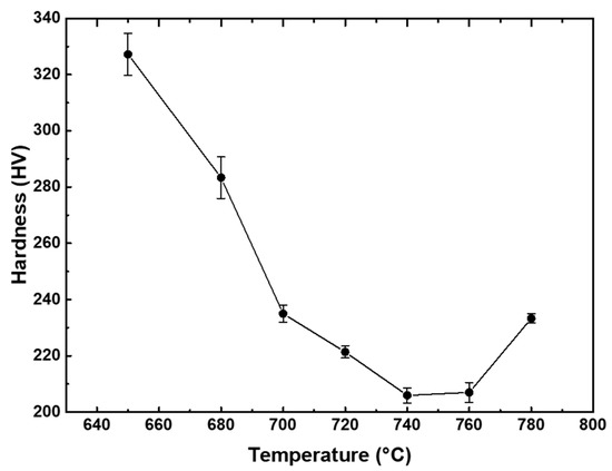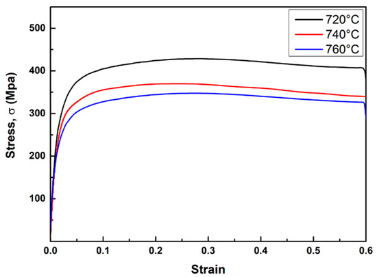 In addition to the effect on the DET, the deformation temperature also affects the deformation stress. The stress–strain curves at different deformation temperatures are depicted in Figure 12. The higher the deformation temperature, the smaller the deformation resistance and the smaller the yield strength. The deformation resistance and yield strength of the sample deformed at 760 °C are the smallest. The deformation resistance and yield strength are usually proportional to the hardness [24]. The hardness of the samples deformed at 720 °C, 740 °C, and 760 °C is 257 HV, 244 HV, and 217 HV. For the joint influence of DET and deformation resistance, the hardness of the sample deformed at 760 °C is obviously lower than that of the others.