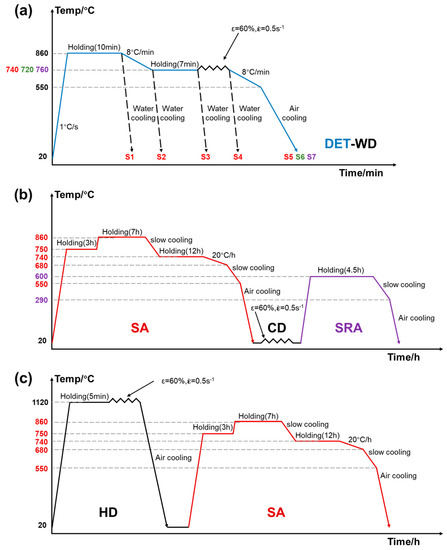 - The HD process that combines with SA process (HD-SA): the samples were heated to 1120 °C at the rate of 5 °C/s. After holding for 5 min, the samples were deformed with a 60% reduction at the same rate of 0.5 s−1. After that, the samples were put out from the furnace for air-cooling and the traditional isothermal SA process is conducted at last.