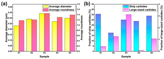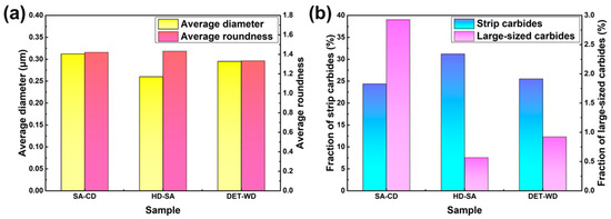 Statistical result of carbides during the DET-WD process: (a) average diameter and average roundness; (b) the proportion of strip carbides and large-sized carbides.