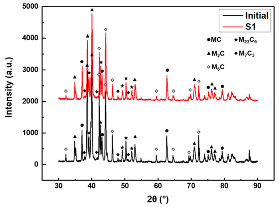 In the whole process, the carbides are first dissolved and then precipitated. The XRD patterns of carbide powder in the initial material and the sample after holding at 860 °C for 10 min are shown in Figure 7. The M2C, MC, M6C, M23C6, and M7C3 alloy carbides can be detected both in the initial and partially austenitized samples. This indicates that the carbide types have not been changed after this process.