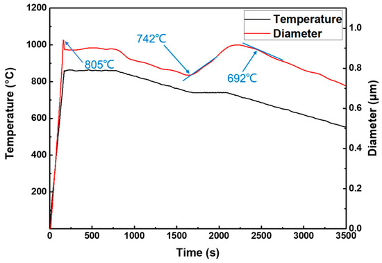 The thermal expansion curve of the DET process is depicted in Figure 9, which can indicate the evolution of ferrite during the whole DET-WD process. From the curve, it can be seen that ferrite begins to transform into austenite at 805 °C during the heating process. Therefore, after holding for 10 min, there is martensite in the water-cooled structure (Figure 5a). The carbon concentration in the structure is uneven due to the partial dissolution of carbides, which is also one of the conditions for the occurrence of DET. It is observed that DET occurs during the cooling. Austenite starts to transform into ferrite at 742 °C. Therefore, there are both martensite and ferrite in Figure 5b. When holding at the DET temperature, austenite continues transforming into ferrite, resulting in the reduced martensite in the water-cooled structure (Figure 5c). The subsequent WD can refine ferrite while breaking carbides. Hence, the fine grain structure can be obtained for the DET-WD process [23]. After the process, there is no martensite in Figure 5e, indicating that the remaining austenite has been completely converted to ferrite at 692 °C.