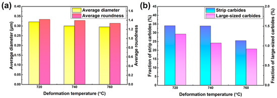 The statistical result of carbides at different deformation temperatures is shown in Figure 11. With the increase in deformation temperature, the roundness and diameter of carbides are decreased, as well as the proportion of strip carbides and large-sized carbides. It suggests that the spheroidization effect becomes better with the increase in deformation temperature. In the previous DET test, it is found that the carbides obtained by holding at different temperatures are variant. There exists an optimal temperature between 720 °C and 760 °C, which can maximize the degree of DET. Consequently, in the process, the closer the deformation temperature is to the optimal temperature, the higher the proportion of spherical carbides and the better the roundness. The result shows that the spheroidization effect of the sample deformed at 760 °C is the best, with the diameter of 0.295 μm and the roundness of 1.333.